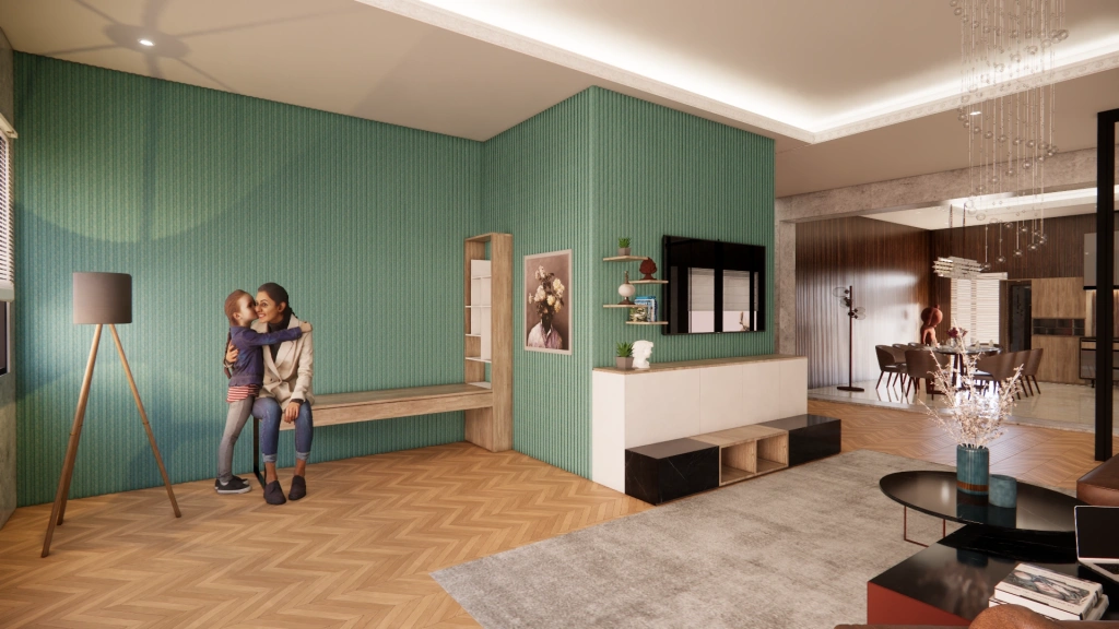 3 mm Akustik siyah renkli Keçe üzerine 4 mm mdf eklenmiştir. Bunun üzerine ,mdf çıtalar ile duvar paneli oluşturulmuştur. Yüzeyine soft Tissue uygulaması yapılmıştır.Böylece yüzeyler Kadife dokusu ve yumuşaklığına sahipdir.